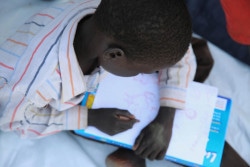 子どもにやさしい空間で絵を描く、家族と離ればなれになった南スーダンの男の子。 |