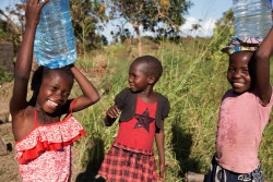 きれいな水を嬉しそうに運ぶ、避難生活を送る子どもたち。 |