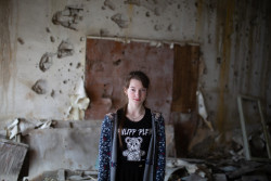 2014年から続く紛争による砲撃で破壊された教室に立つ14歳のソニアさん。 |