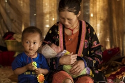 ベトナムの少数民族モン族の家庭で、2歳の男の子と生まれたばかりの赤ちゃんを抱える20歳の母親。 |