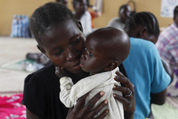 急性栄養不良に苦しむ生後9カ月のガラン・アコルちゃんを抱く母親。 (2018年11月撮影) |