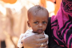 イエメン南部ラヒジュ県の国内避難民キャンプで、生後4カ月の娘を抱く母親。(2019年2月撮影) |