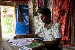 コックスバザールのロヒンギャ難民キャンプで暮らす18歳のウラーさんは、年齢的に学校に通う機会がなく、毎日独学で勉強をしている(2019年6月24日) |