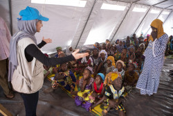 国内避難民キャンプに設置された仮設学習スペースで、子どもたちと触れ合うマズーン・メレハンさん。(2019年8月20日撮影) |