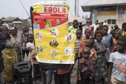 エボラ出血熱に関する地域の人々の質問に答えるスタッフ。(2019年8月21日撮影) |