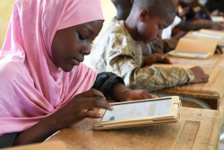 授業でタブレットを使用するニジェールの子どもたち。(2019年6月撮影) |