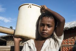 バングラデシュのクトゥパロン難民キャンプで、週に2回バケツに入れたほうれん草を売りに行く8歳のイドルスくん。(2019年6月撮影) |