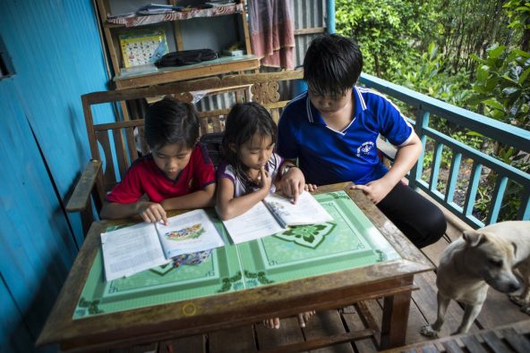 弟と妹の宿題を手伝っている長兄のバオくん(右)。兄弟で家にトイレと手洗い場を設置するように家族に働きかけました。 |