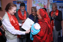 ユニセフ事務局長 ヘンリエッタ・フォアから出生登録書を受け取るネパールの母親。(2019年11月3日撮影) |