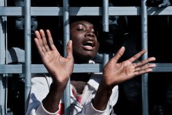 拘留施設の牢の中に捕らわれた移民の男の子。(2017年1月撮影) |