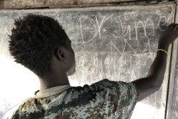「子どもにやさしい空間」の黒板の前に立ち、「平和」の文字を指さす元子ども兵士のジェームスさん(仮名)。(2020年1月撮影) |