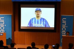 2018年11月、ユニセフハウスで開催されたユニセフ『子どもの権利とスポーツの原則』発表会にビデオメッセージ寄せてくださった筒香選手。 |