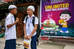 小学校の側にある屋台で購入したファストフードを食べるバンクラデシュの男の子たち。(2019年9月撮影) |