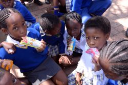 小学校の売店でお菓子を買って食べる南アフリカの子どもたち。(2019年9月撮影) |