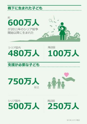 この間に紛争の中に生まれた子どもは480万人にのぼり、さらに100万人が、周辺国で生まれながらの難民として誕生しました。