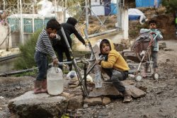 ギリシャのサモス島バチにある難民・移民受入・身元確認センターで、容器に水を汲む子どもたち。(2020年3月6日撮影) |