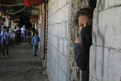 難民シェルターとして使用されている工事中の建物で、口を覆って部屋の外を眺めるシリア難民の女の子。(2020年3月17日撮影) |