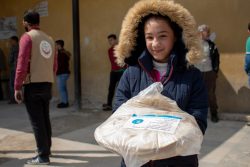シリア・アレッポ近くのal-Zebdiehで、袋にCOVID-19周知のためのシールが貼ってあるパンを持つ12歳のナジャーフさん。(2020年4月2日撮影)※本文との直接の関係はありません |