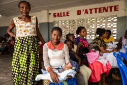 キンシャサ郊外にある診療所で、2人の子どもにはしかの予防接種を受けさせるため、助産師の女性と一緒に待つ母親。(2020年1月27日撮影) |