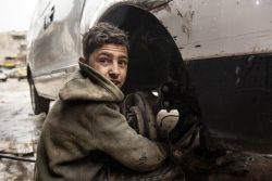 学校を辞め、2年前から自動車整備店で働いている13歳のイマドくん。7人家族の長男で、イマドくんが稼いだお金だけが家族の収入源になっている。(シリア、2020年2月撮影) |