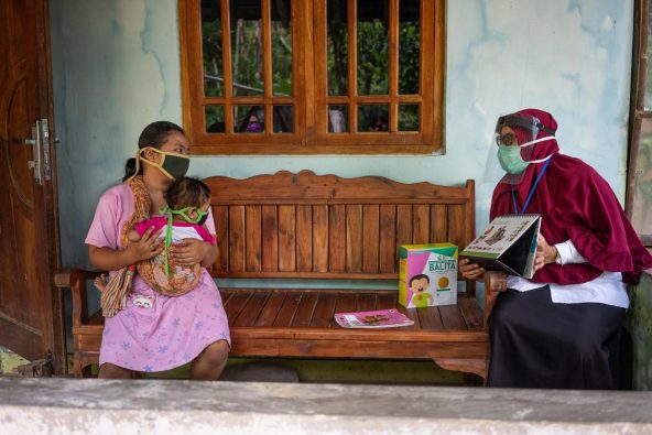 2020年6月初旬までに、それらの支援が届いた地域はインドネシア全34州517県に及んでいます。農村部の保健員は、初めて母親になる妊婦を対象に、授乳に関するサポートや新生児ケアのアドバイスを行うとともに、ガイドラインの内容を州・県レベルで実施していくための研修を受けています。