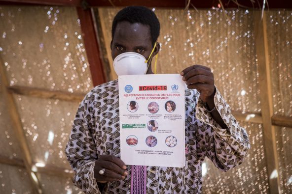 マリ中央部のモプティにある避難民キャンプで、コミュニティ啓発活動に携わるオウマーさんが、新型コロナウイルスの感染予防方法を、避難民の子どもたちと家族に伝えています。