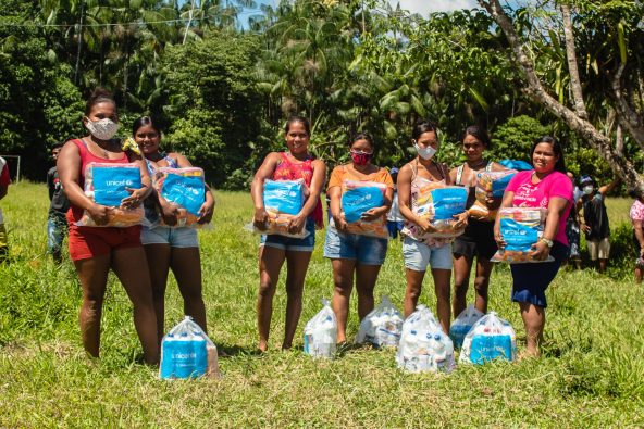 6月26日、ブラジル北部のパラ州のアマゾン流域で暮らす住民たちが、衛生キットや食料など、ユニセフの支援物資を受け取りました。