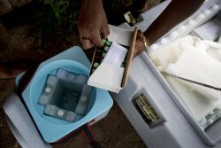 適切な温度に保ったまま運ぶため、ワクチンを保冷箱に詰める様子。(パプアニューギニア、2019年3月撮影) |