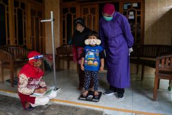 COVID-19パンデミック中に中央ジャワ州にある村を訪れた助産師に体重を計ってもらう4歳のシンディーちゃん。(インドネシア、2020年8月19日撮影) |