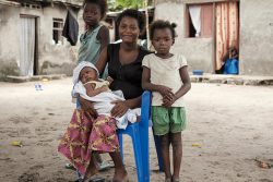 はしかの予防接種を受けた10歳のライッサさん(左)と7歳のメレくん(右)と生後1カ月のジェウちゃん(真ん中)。母親のブワンガさんははしかが原因で2人の子どもを亡くしている。(コンゴ民主共和国、2020年1月撮影) |