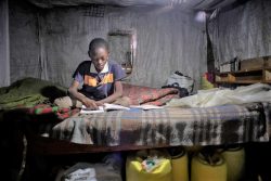 自宅で小学6年生の教科書を読み、練習問題に取り組む11歳のラファエルくん。家族が携帯電話を持っていないため、オンライン学習に参加できずにいる。(ケニア、2020年7月撮影) |