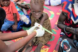 ピボールにある栄養センターで上腕計測メジャーによる栄養不良の検査を受ける4歳のカタリンちゃん。(南スーダン、2020年9月撮影) |
