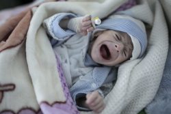 重度の栄養不良に陥り、サヌアの病院で治療を受ける生後4カ月のシュアイブちゃん。(イエメン、2020年2月撮影) |