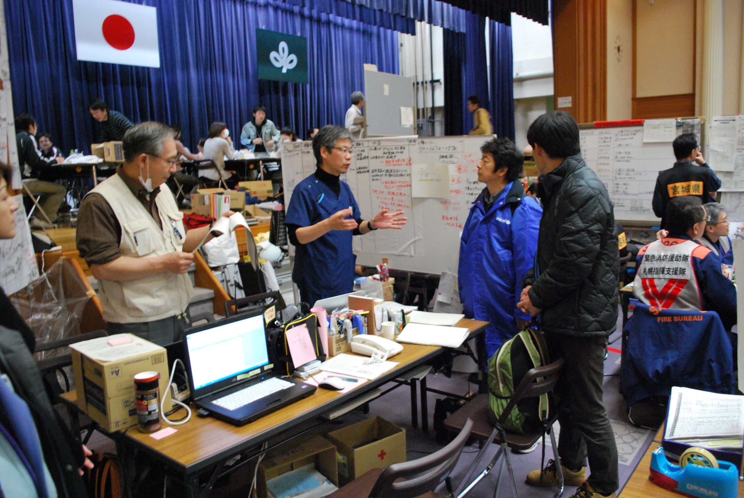 2011年3月 宮城県庁内の災害対策本部で協議する國井修医師(右から2番目)