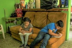 自宅で勉強ができるよう教育省から受け取った教材を使い、ソファの上で勉強する10歳のクリスティアンくんと、いとこで7歳のアリエルさん。(グアテマラ、2020年4月撮影) |