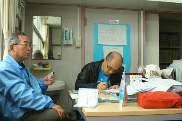 福島県ユニセフ協会の菅田俊雄事務局長(当時・写真左)と、県内の保育園を訪問中の水野谷さん(2011年4月11日撮影) |