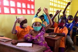 東部にある小学校で、マスクを着用し授業を受ける子どもたち。(カメルーン、2021年3月1日撮影) |