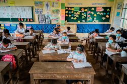 カンポット州の小学校で、距離を空けて授業に参加する子どもたち。(カンボジア、2020年9月撮影) |