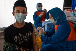 東ジャワ州にあるイスラム学校でCOVID-19ワクチンを受ける教師。(インドネシア、2021年3月23日撮影) |