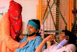 ウッタル・プラデーシュ州で、呼吸困難になり酸素マスクをつける患者。(インド、2021年5月2日撮影) |