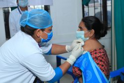 中北部にあるゴルカ郡の保健センターでCOVID-19の予防接種を受ける医療従事者。(ネパール、2021年4月21日撮影) |