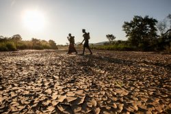 干ばつの被害を受けるグウェンベ渓谷で、乾いた川の上を歩く女性たち。(ザンビア、2020年1月撮影) |