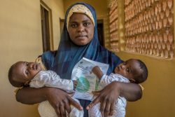 バウチにあるプライマリ・ヘルスセンターで、双子の赤ちゃんの出生証明書を持つ母親。(ナイジェリア、2020年10月撮影) |
