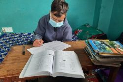 中北部・ドラカ郡の自宅で勉強をする12歳のアショクくん。ネパールでは4月から5月にかけて感染者が急増し、学校が休校している。(ネパール、2021年6月撮影) |