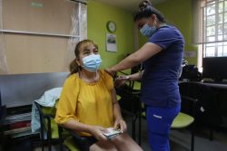 1回目のCOVID-19の予防接種を受ける学校の教師。チリでは教師のワクチン接種を優先的に実施している。(チリ、2021年2月撮影) |