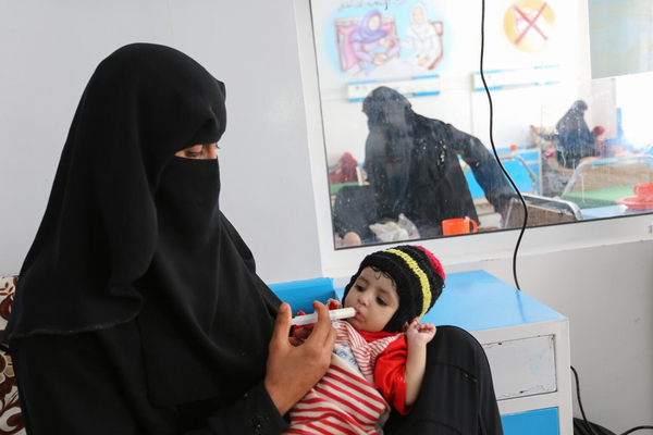 イッブ県にある栄養治療センターで、母親から治療食を食べさせてもらう生後7カ月のウェダッドちゃん。(イエメン、2021年5月撮影)