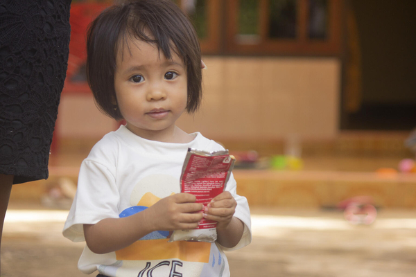 東ヌサ・トゥンガラ州の自宅で、すぐに食べられる栄養治療食(RUTF)を手に持つ、重度の消耗症と診断された1歳のフェリシティちゃん。(インドネシア、2021年2月撮影)