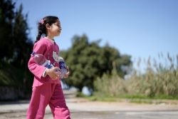 水の入ったペットボトルを持って歩く10歳のシリンさん。家族のために、毎日父親と一緒に水を汲んで自宅まで運んでいる。(2021年3月撮影) |