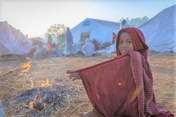 Chagni国内避難民キャンプの中で、火にあたり暖をとる10歳のハヤットさん。(エチオピア、2021年2月撮影) |