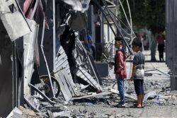 ガザ市で、紛争によって崩れた家の前に立つ子どもたち。(パレスチナ自治区、2021年5月撮影) |